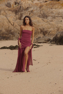 Vestido strapless confeccionado en crep y gasa. Parte del cuerpo confeccionado en crep elasticado que se adapta mejor a cada tipo de cuerpo. Falda confeccionada en gasa con apertura en pierna. Cierre lateral invisible. Trae una bufanda de gasa para complementar el vestido.