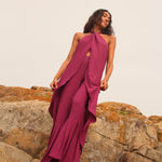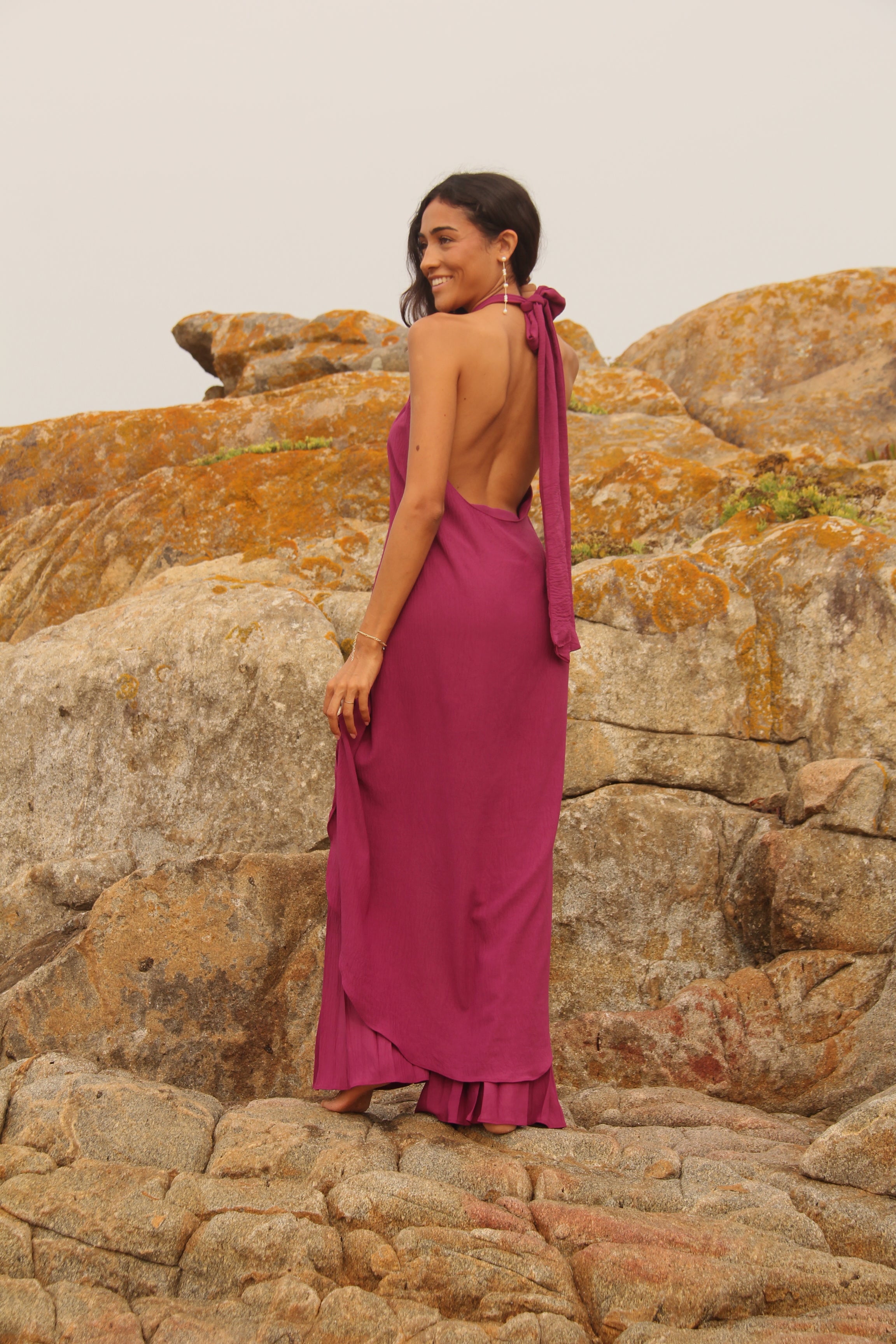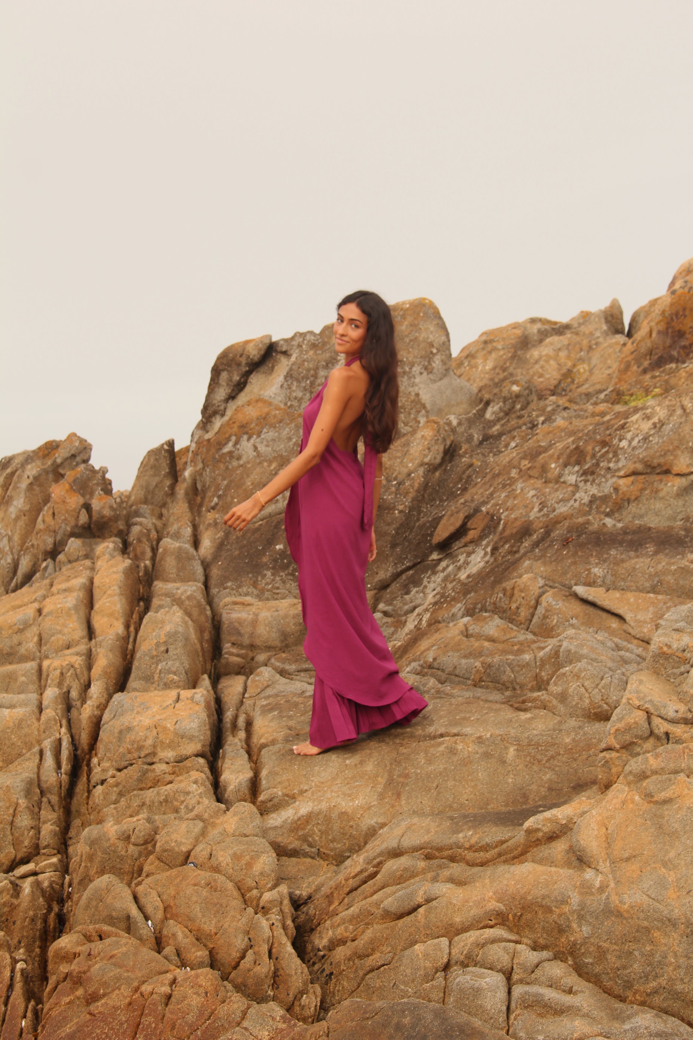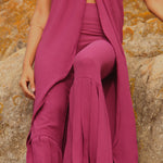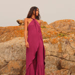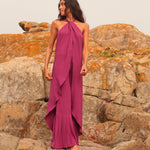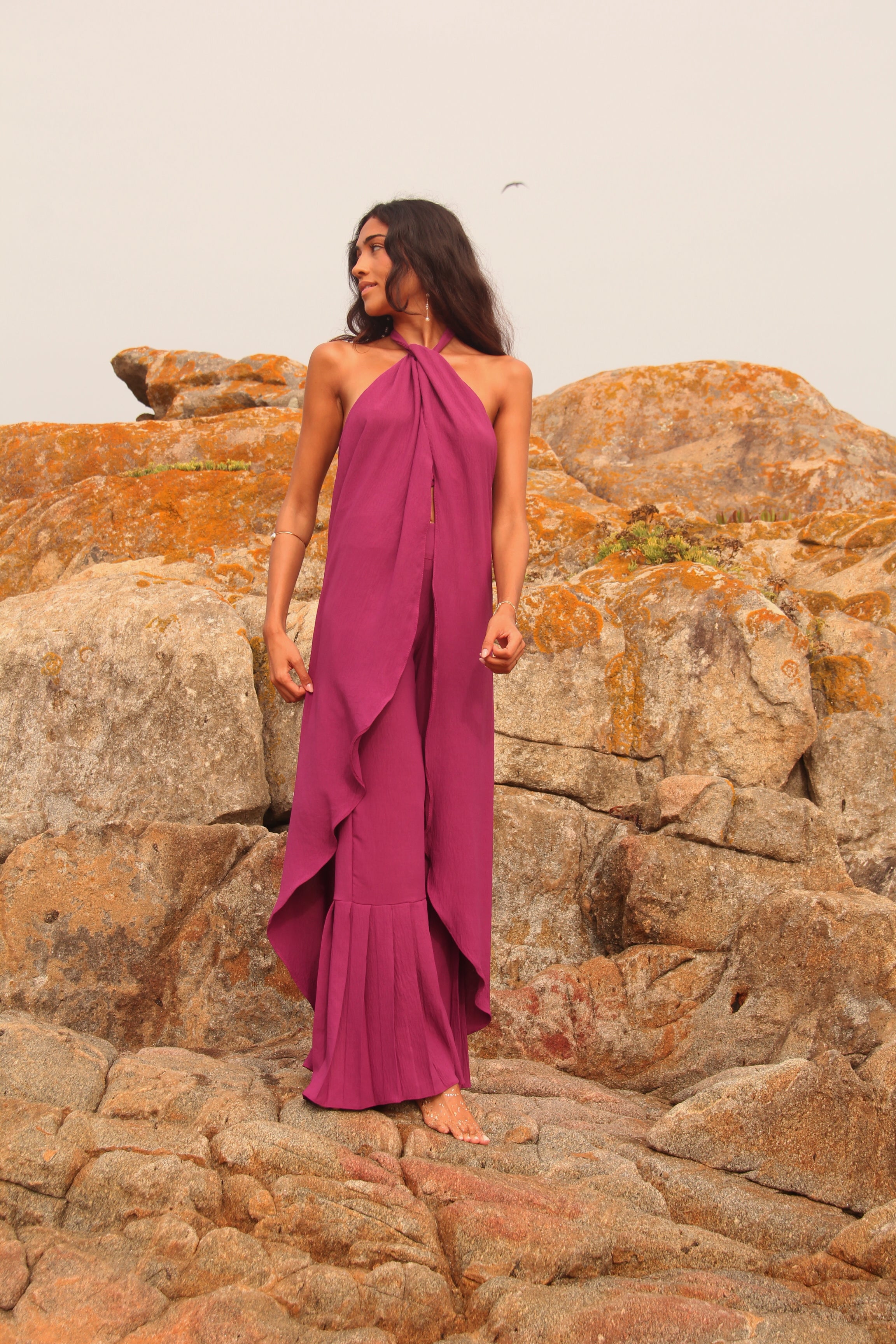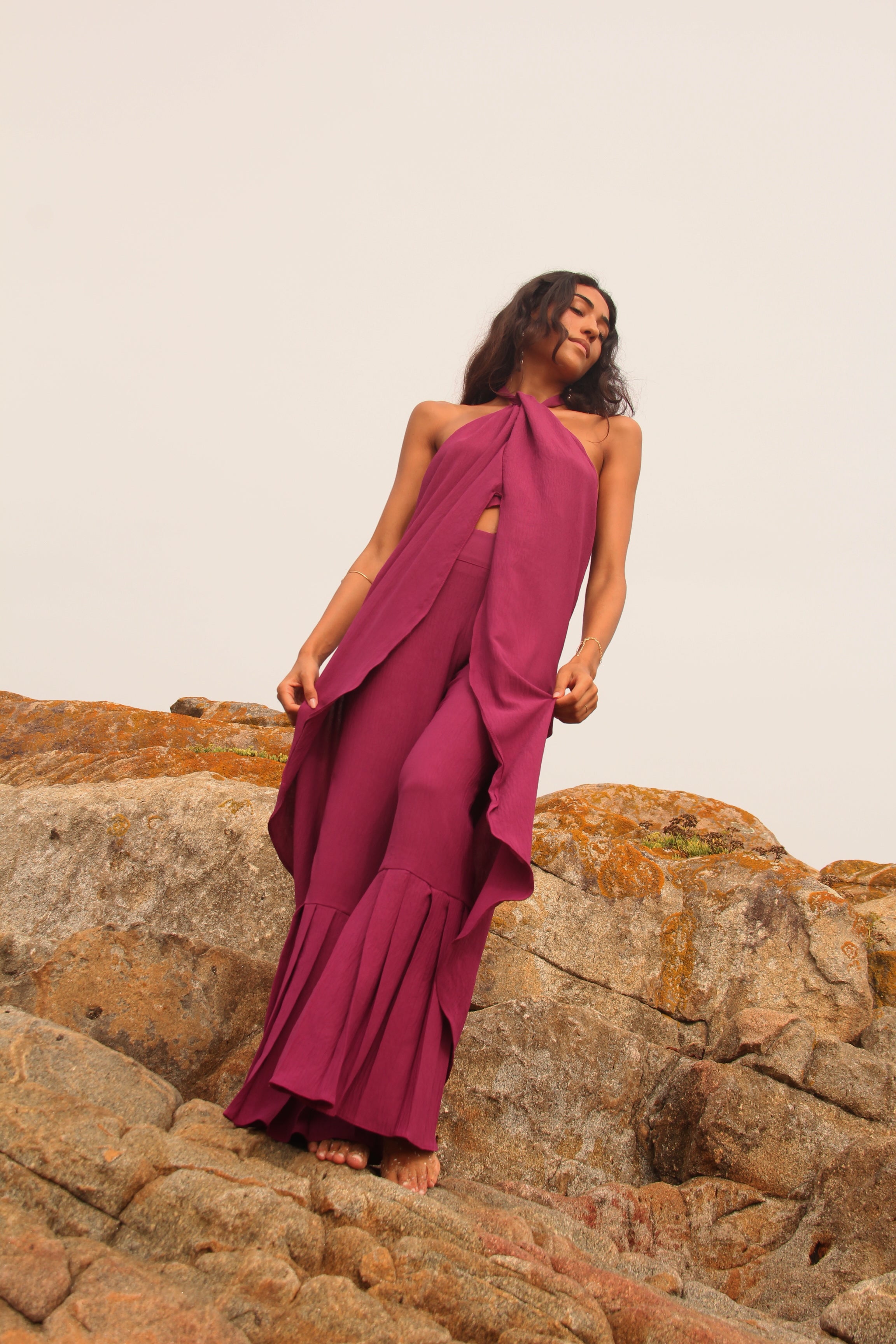 El Conjunto Maya es una prenda que combina estilo y elegancia. Con su top halter amarrado al cuello con espalda descubierta y pantalón recto tableado en la parte inferior, este conjunto es perfecto para cualquier ocasión especial.