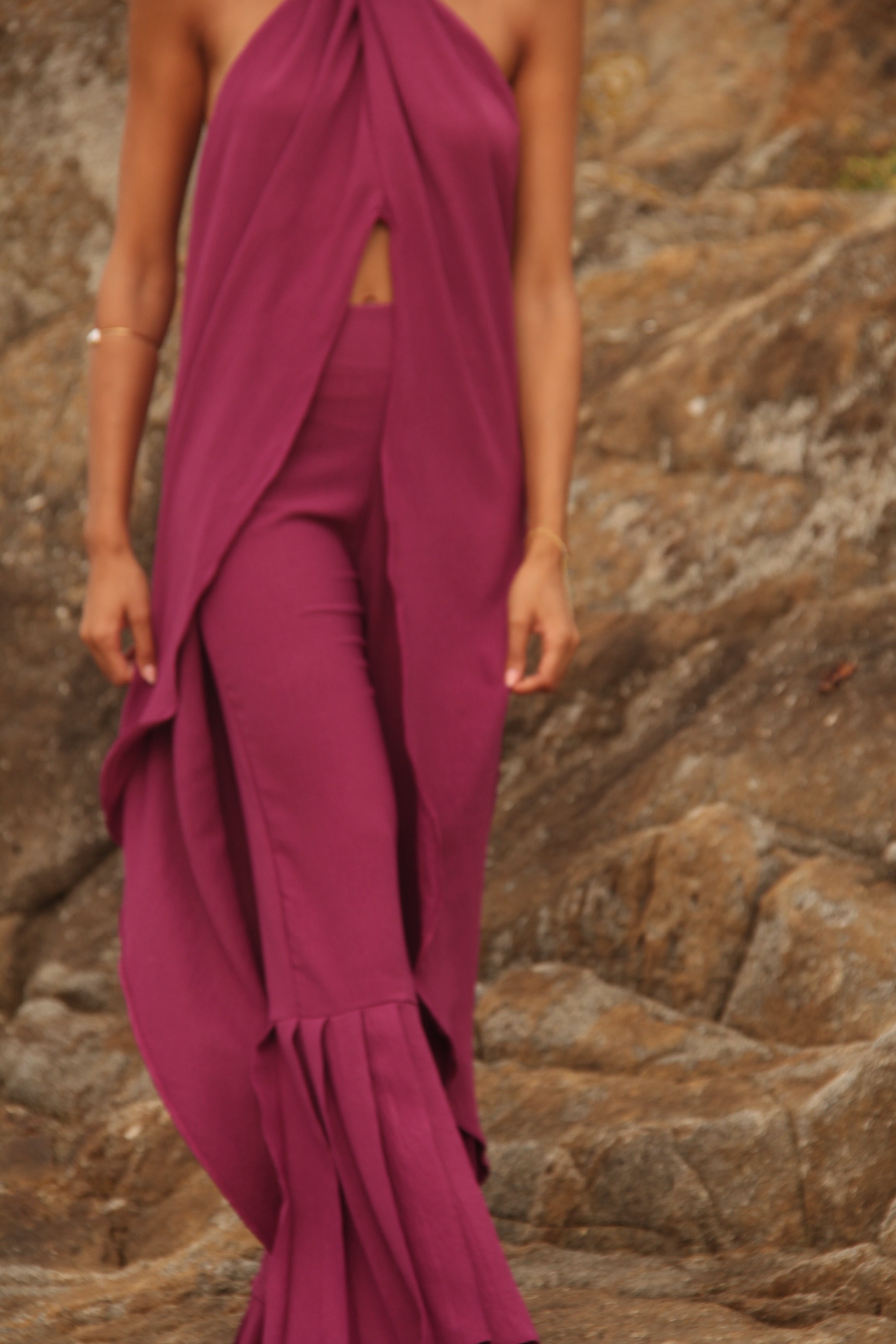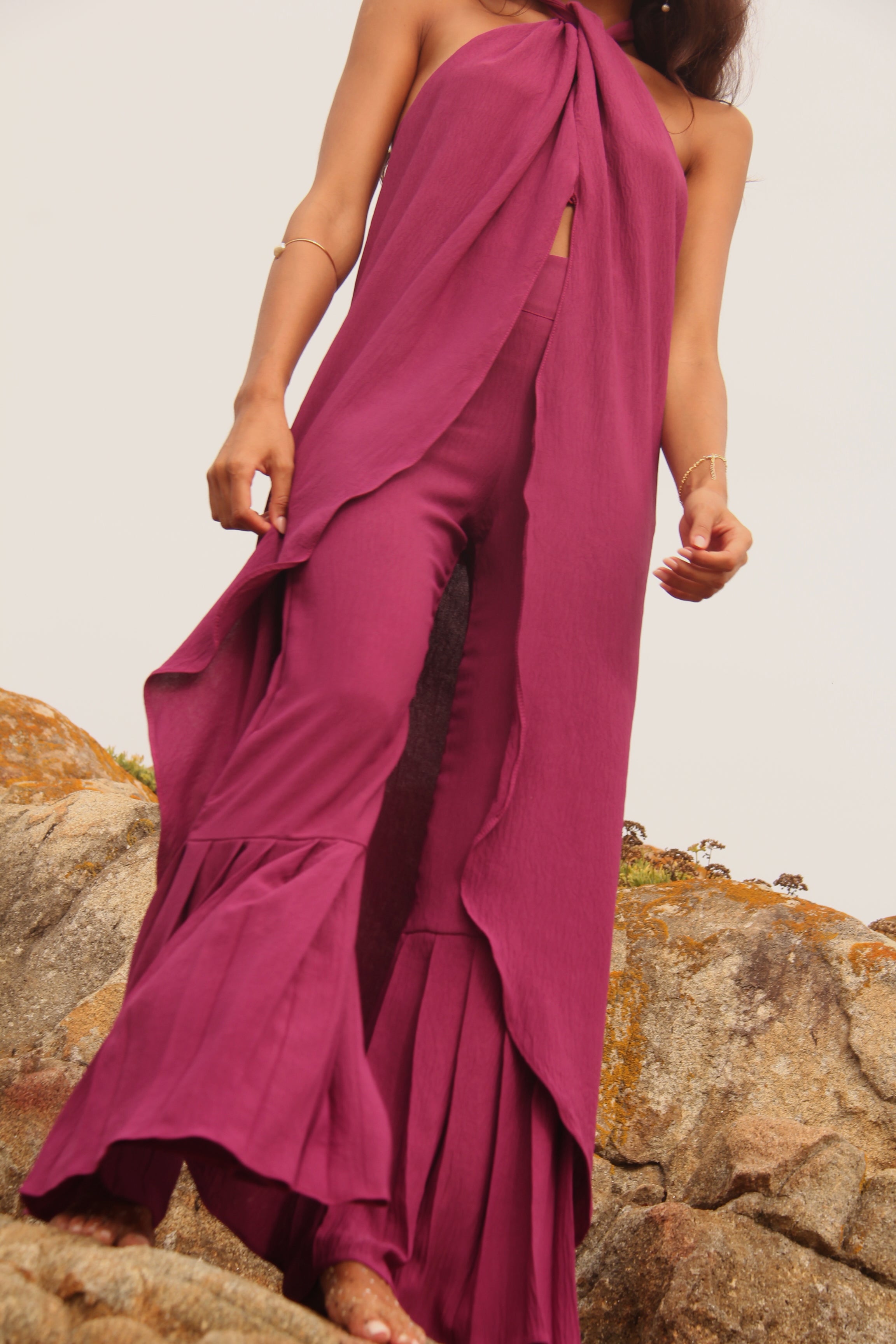• Características: Top halter amarrado al cuello con espalda descubierta y pantalón recto tableado en la parte inferior
