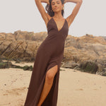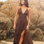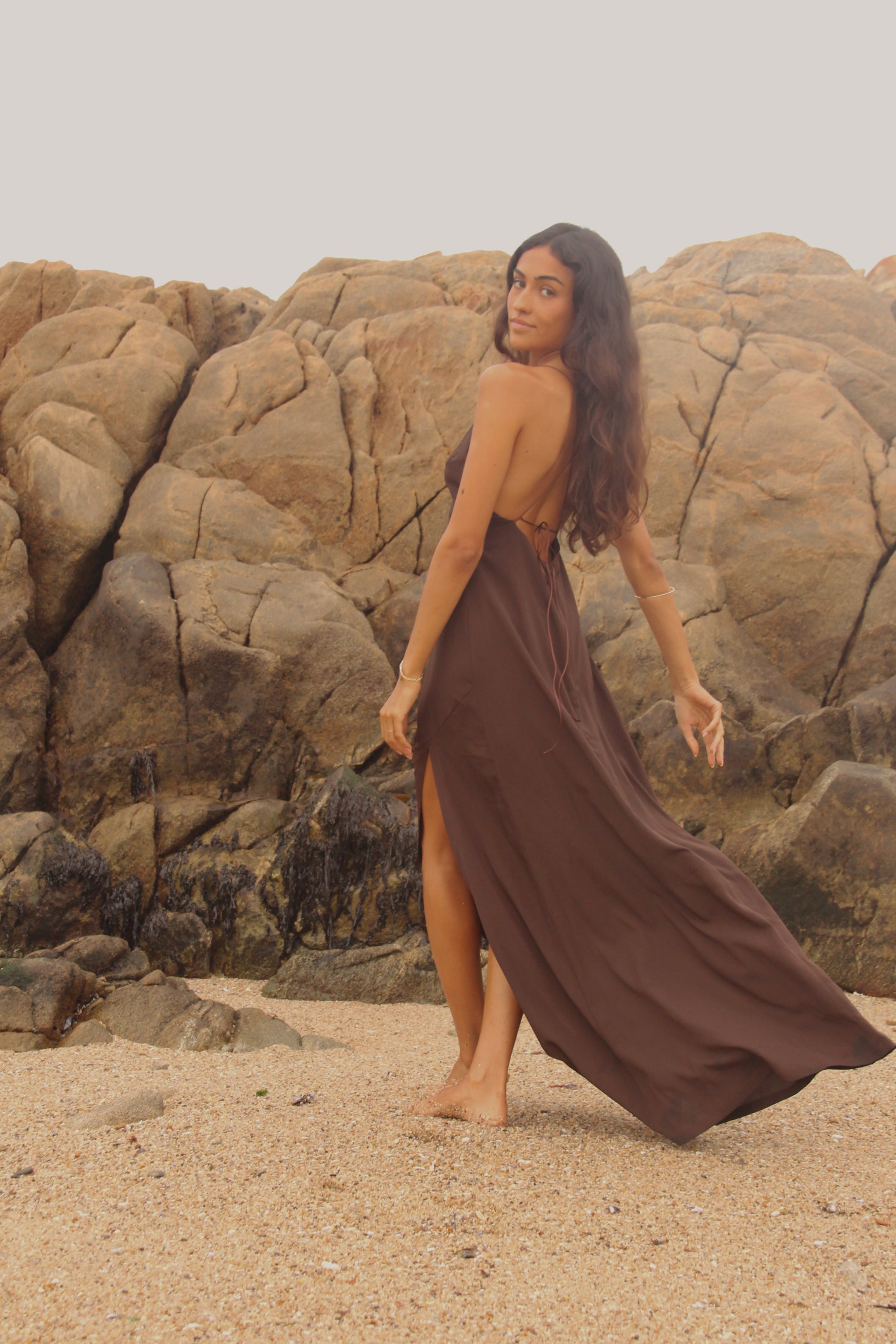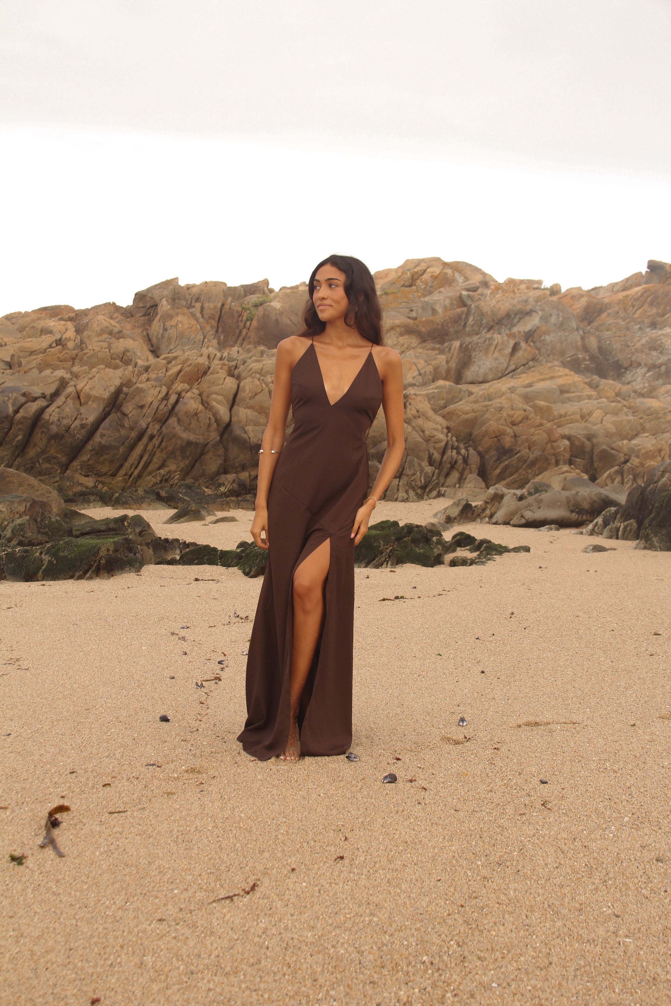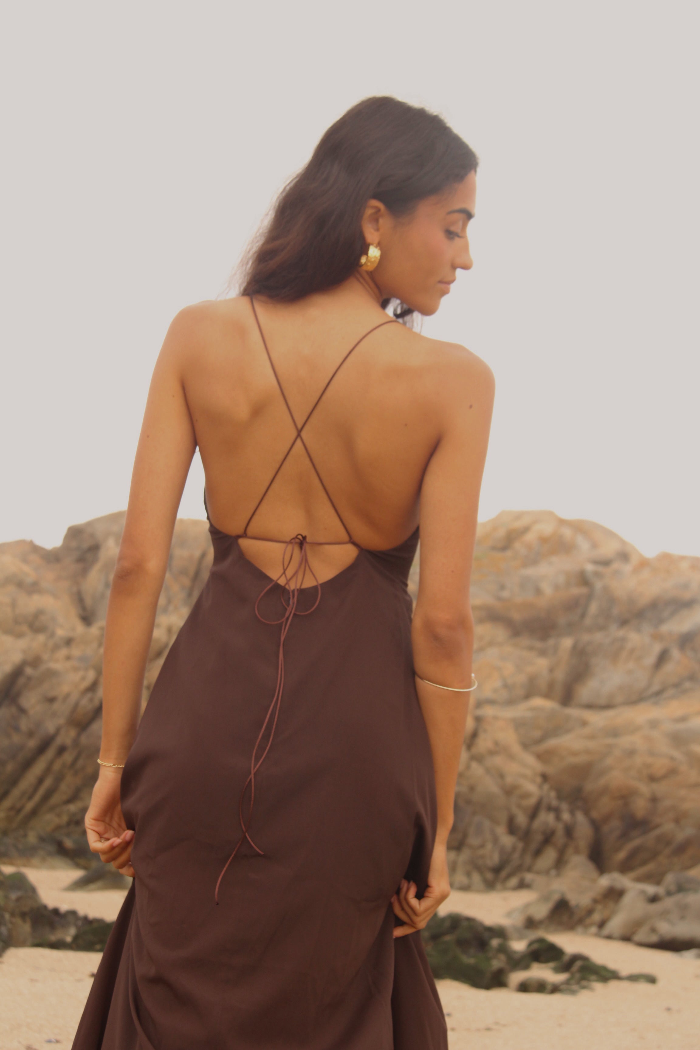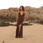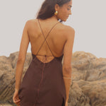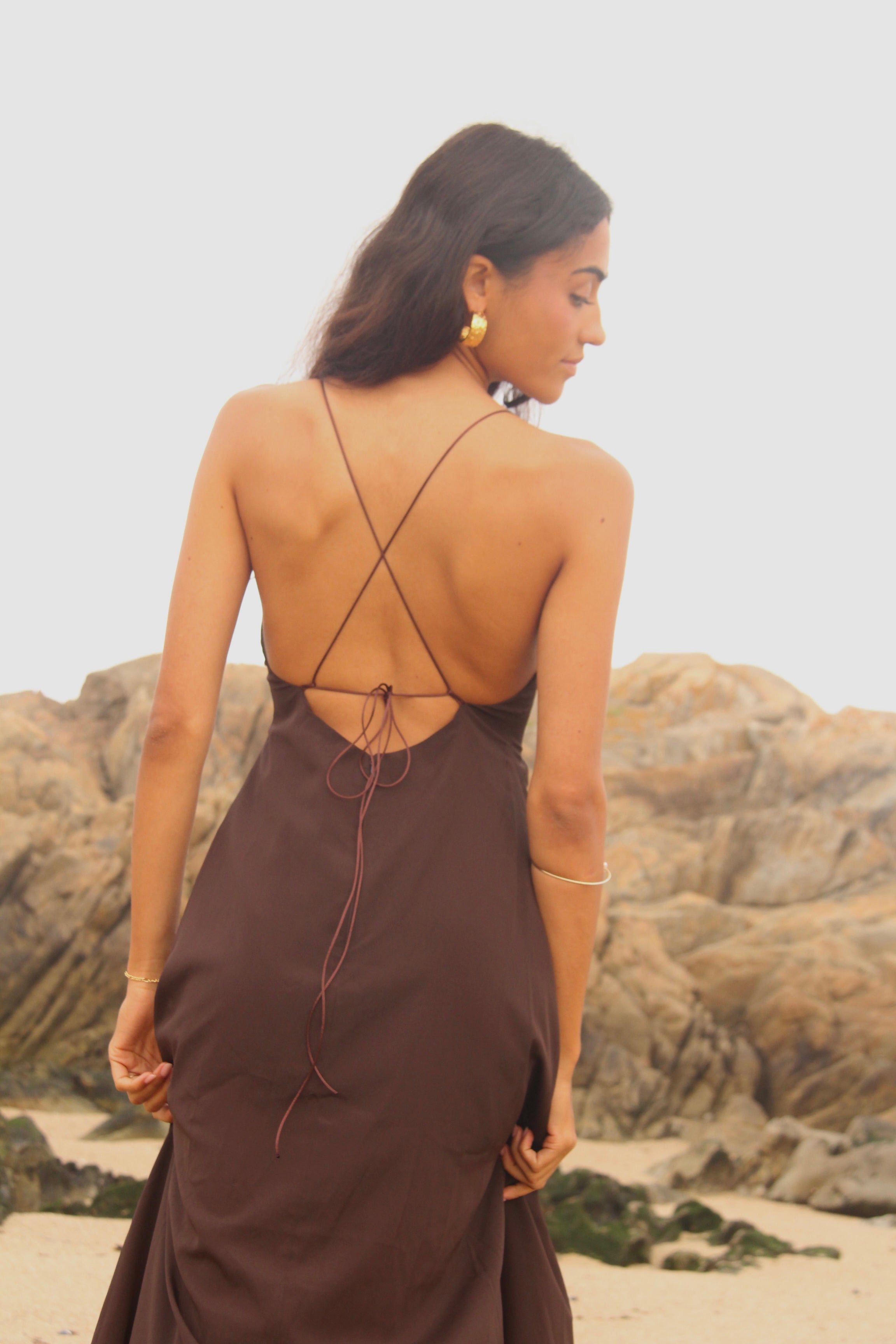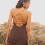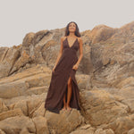 Vestido confeccionado en crep corte en v asimétrico. Tiras delgadas regulables para el tamaño y forma. Espalda descubierta con múltiples amarras.
