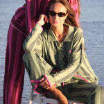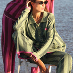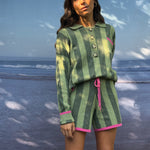 Gillette tejido confeccionado en algodón reciclado y viscosa. Diseño rallado con detalles a color. Amarras delanteras para ajuste.