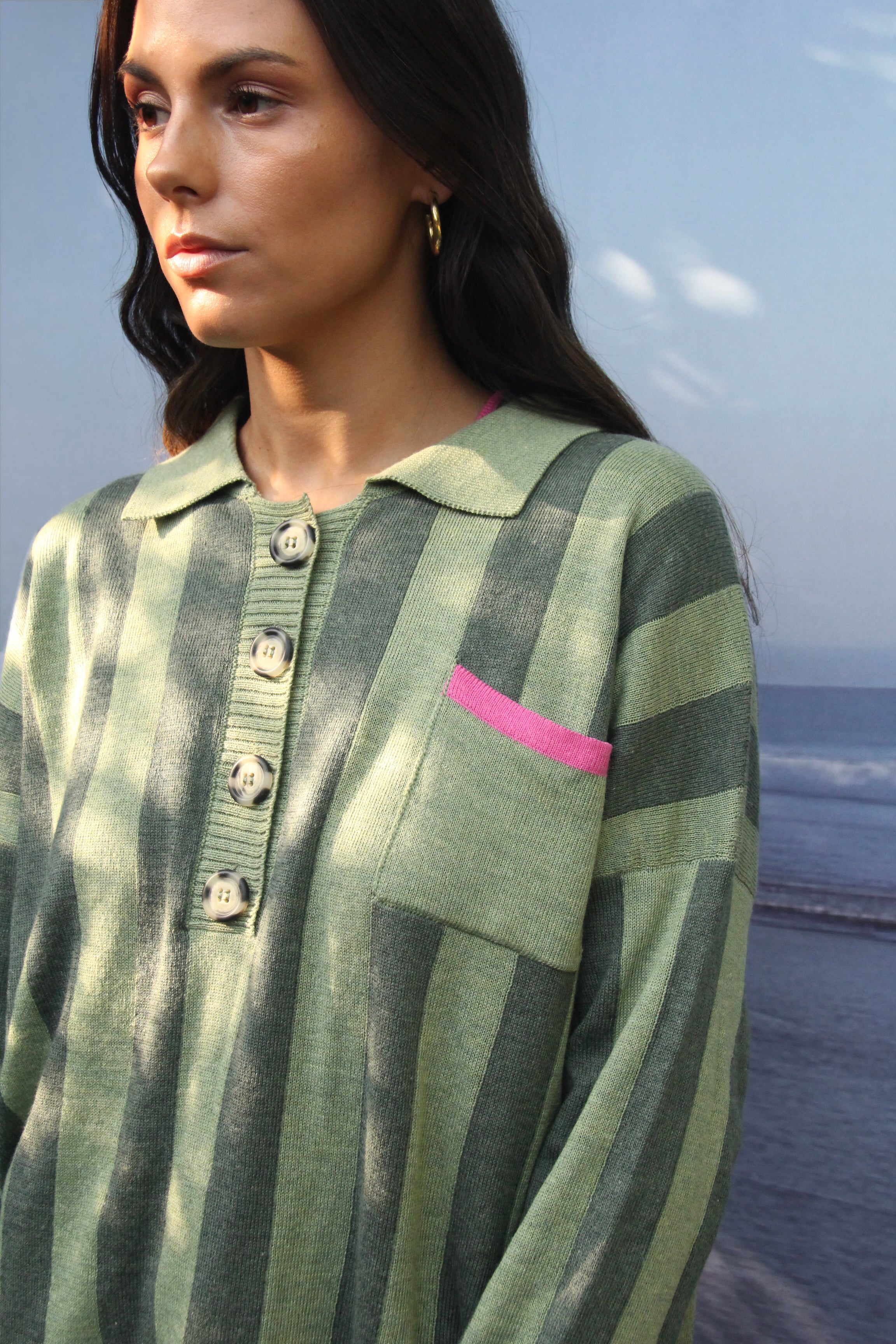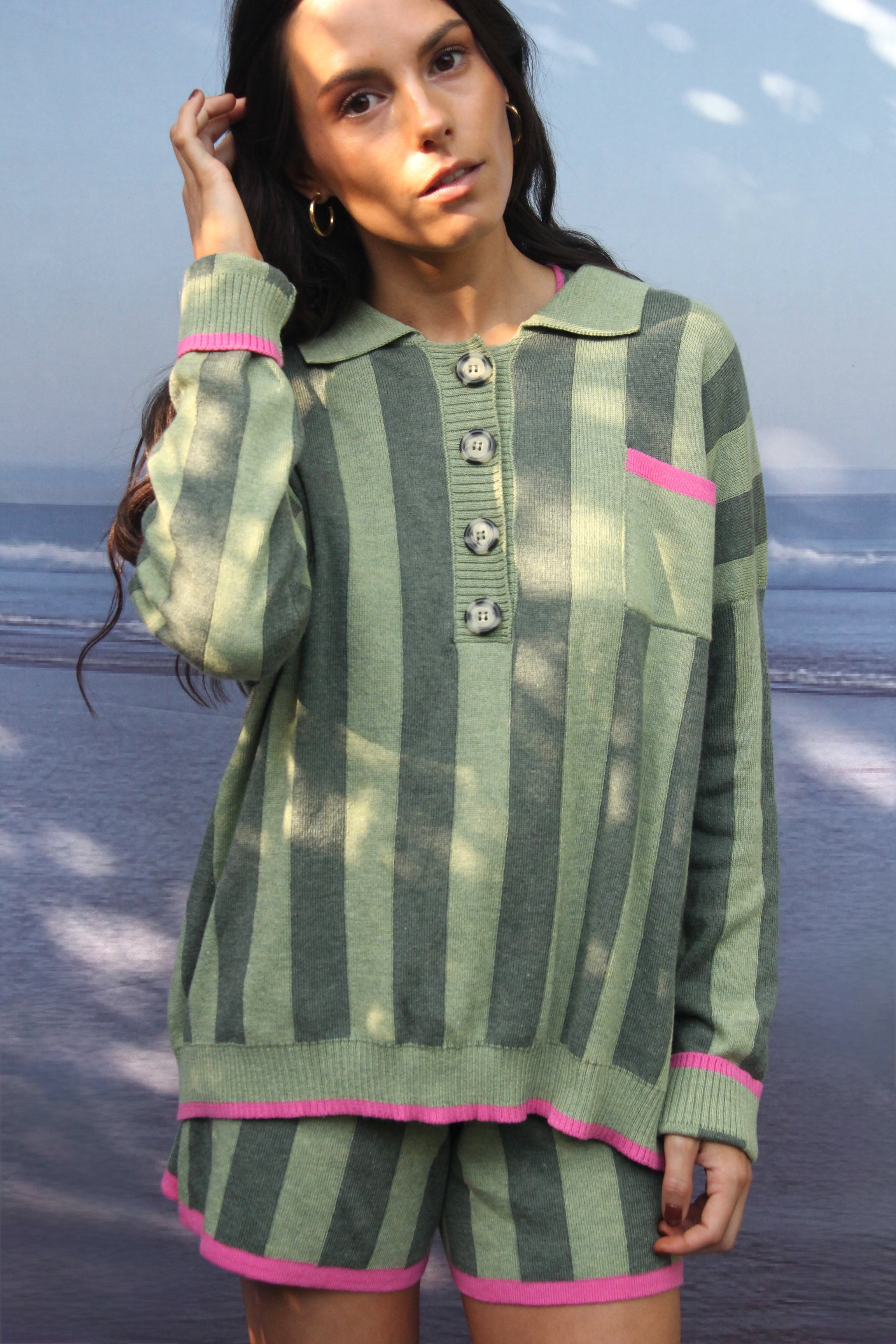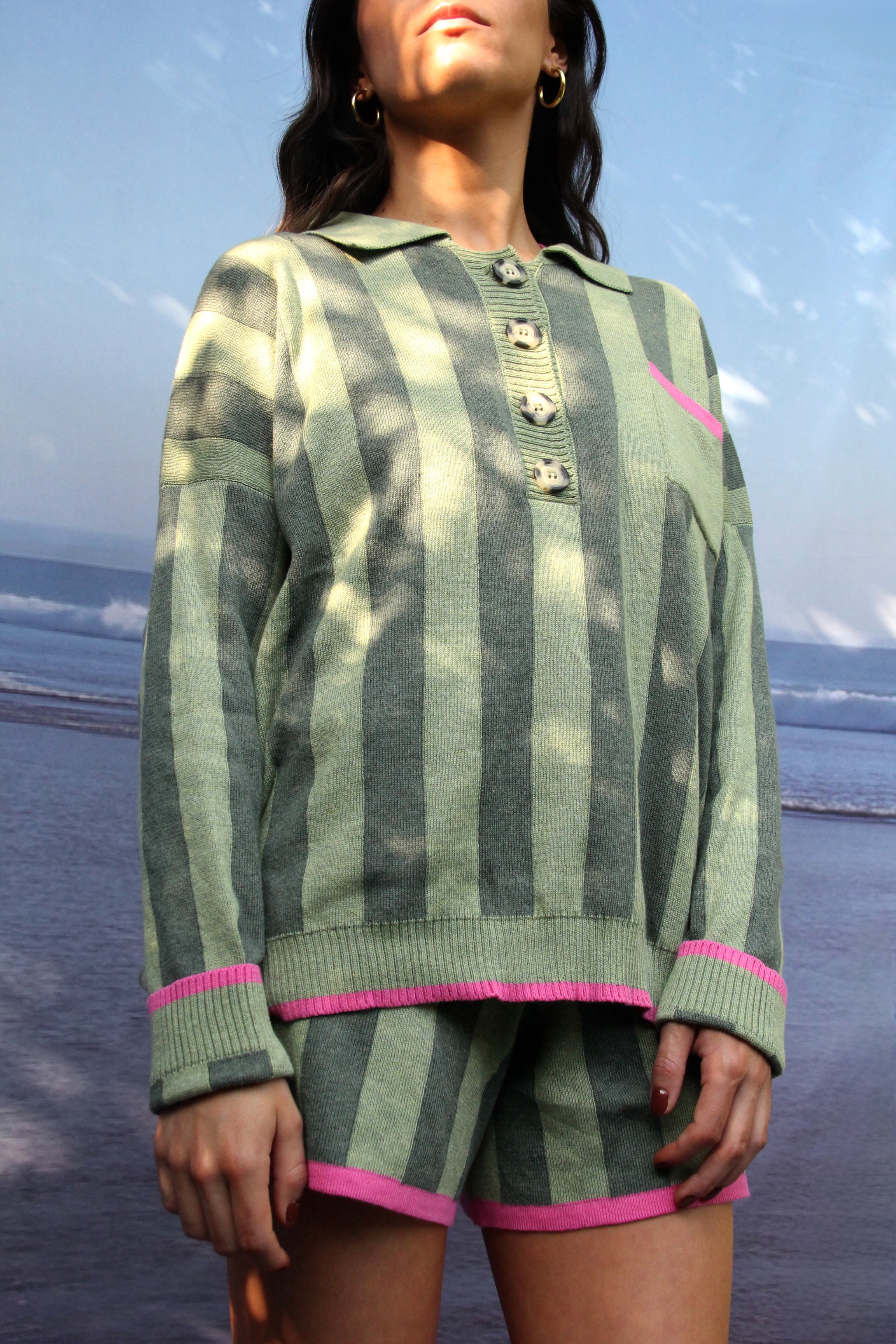 Chaleco confeccionado en algodón viscosa, punto suave y delgado para primavera y verano. Fit oversized, abotonado y cuello polo con detalles a color. Talla única.