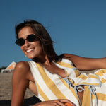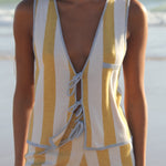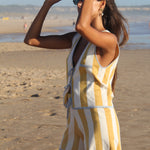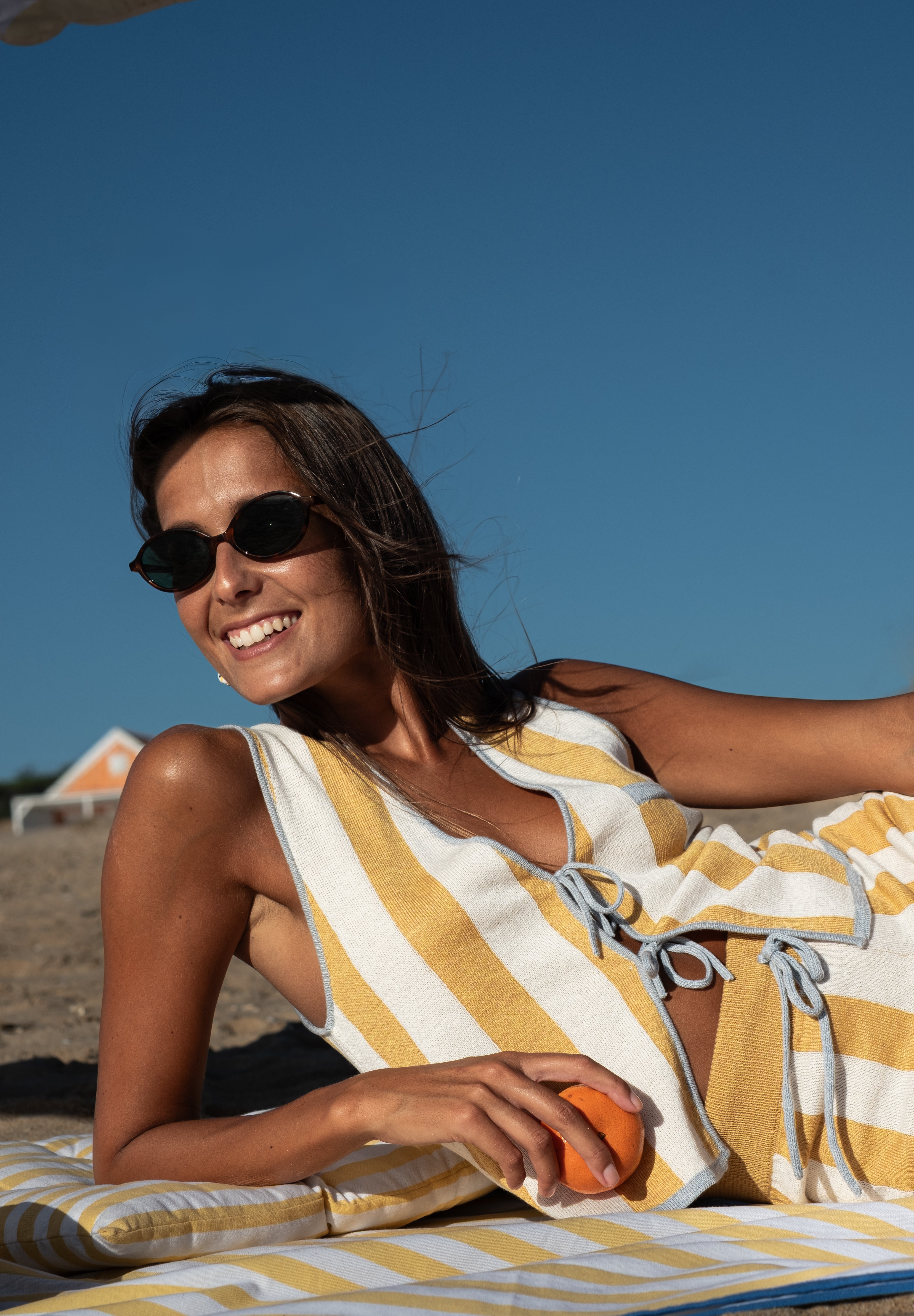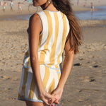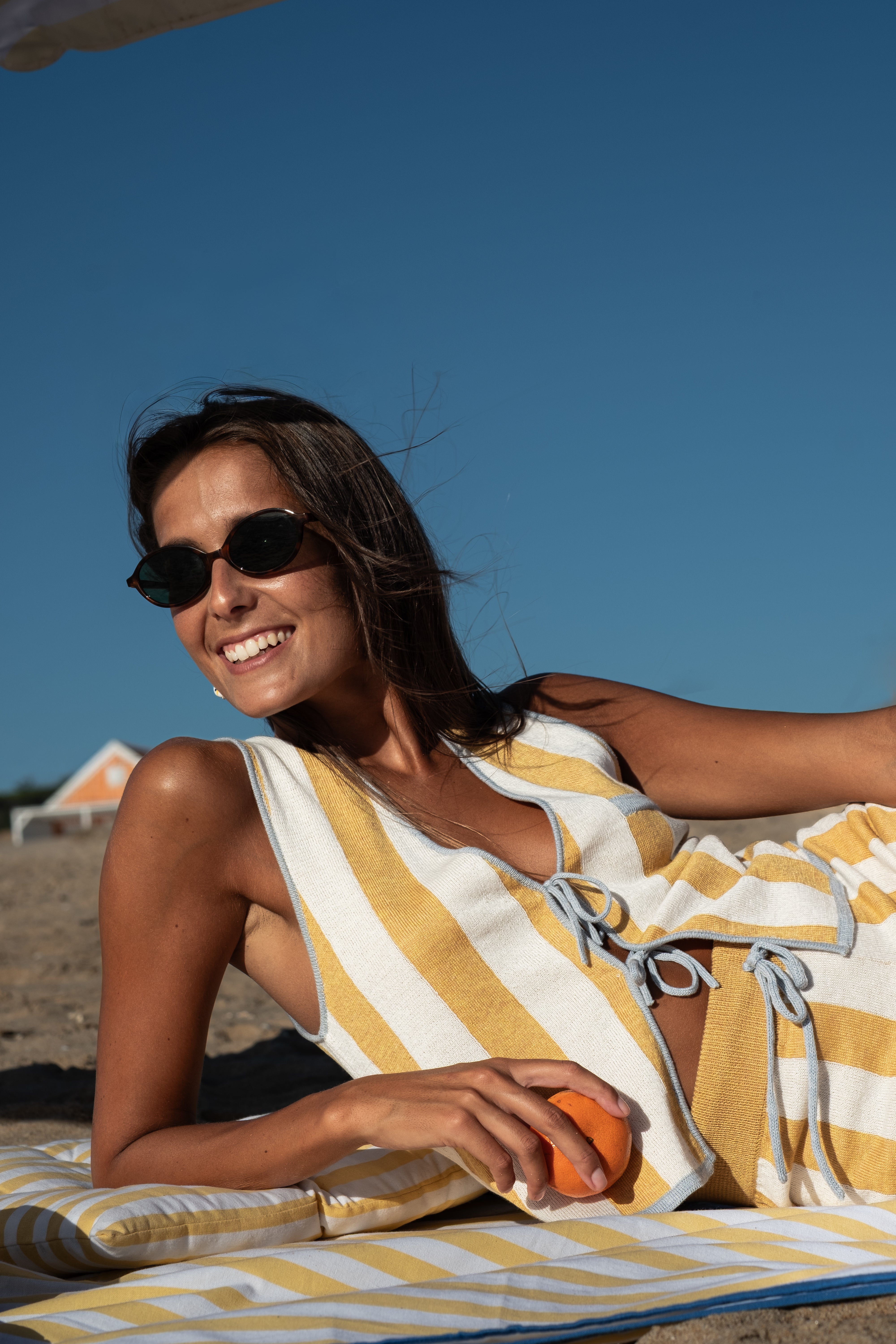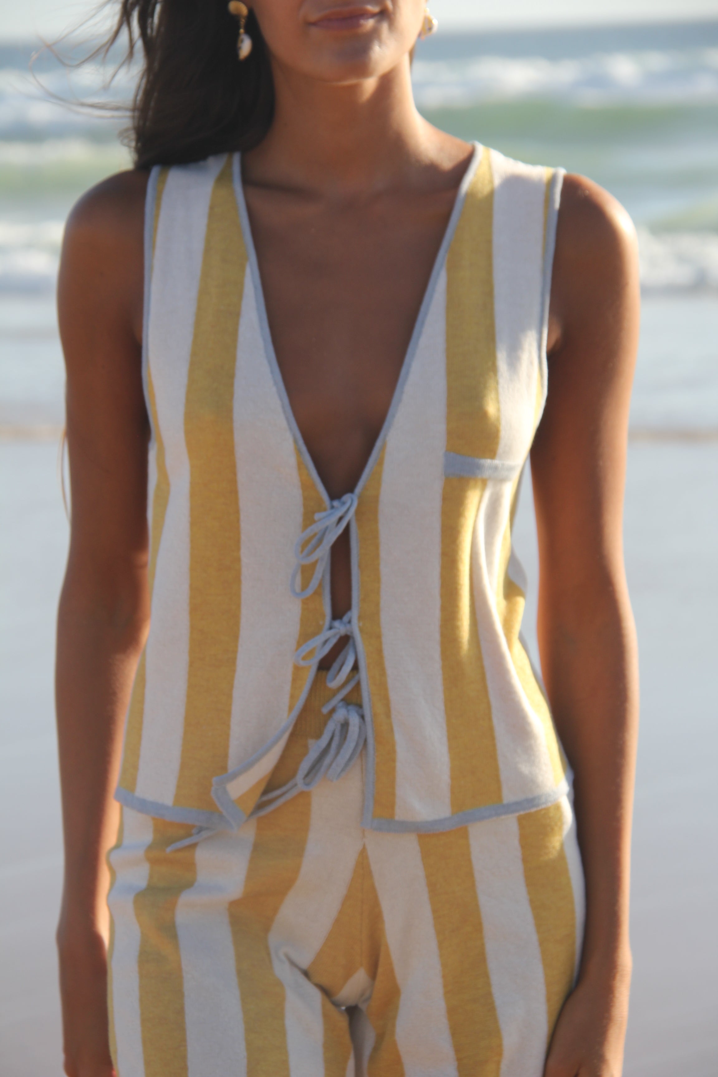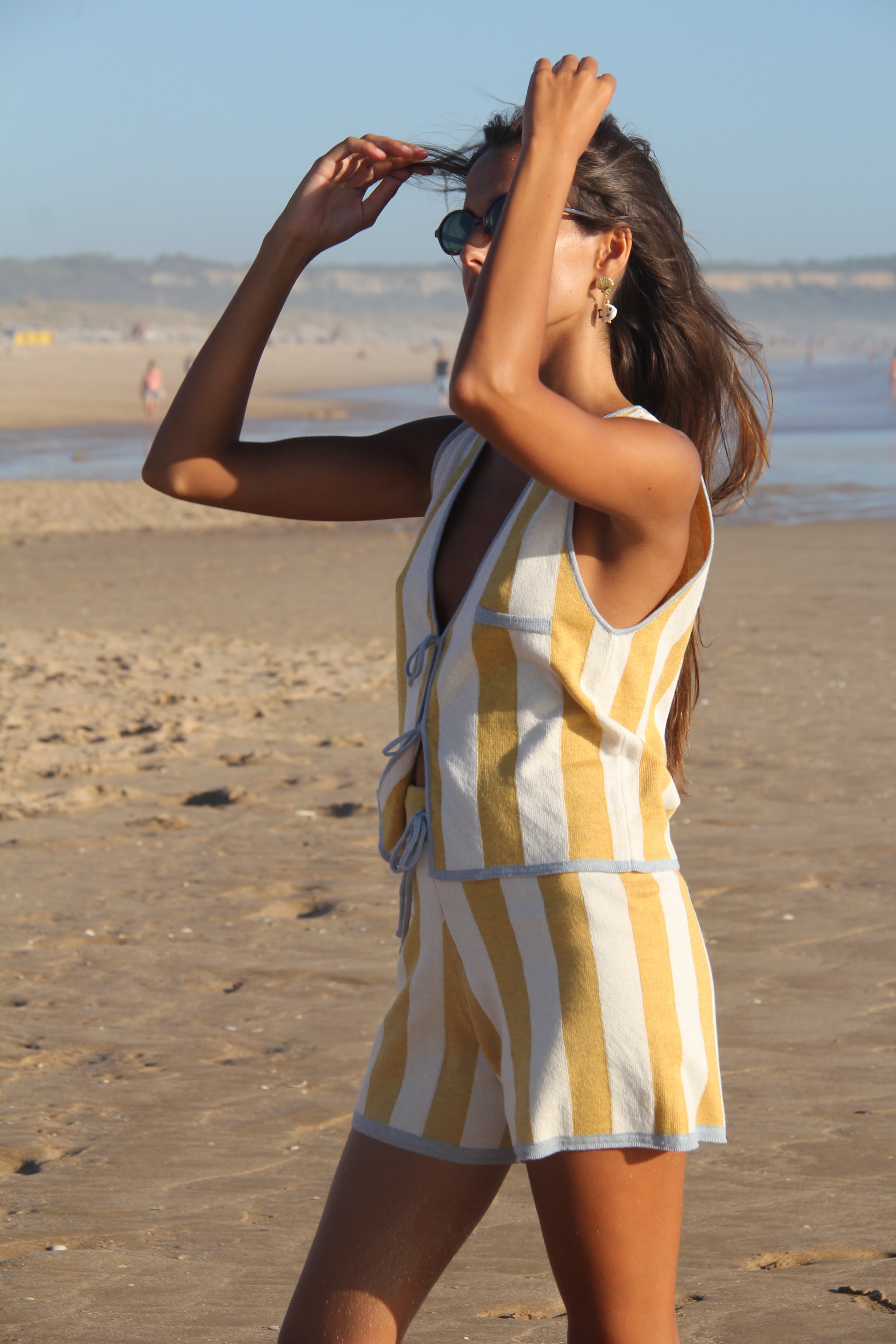 Gillette tejido confeccionado en algodón reciclado y viscosa. Diseño rallado con detalles a color. Amarras delanteras para ajuste.