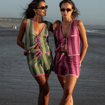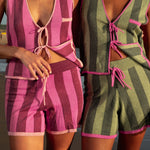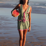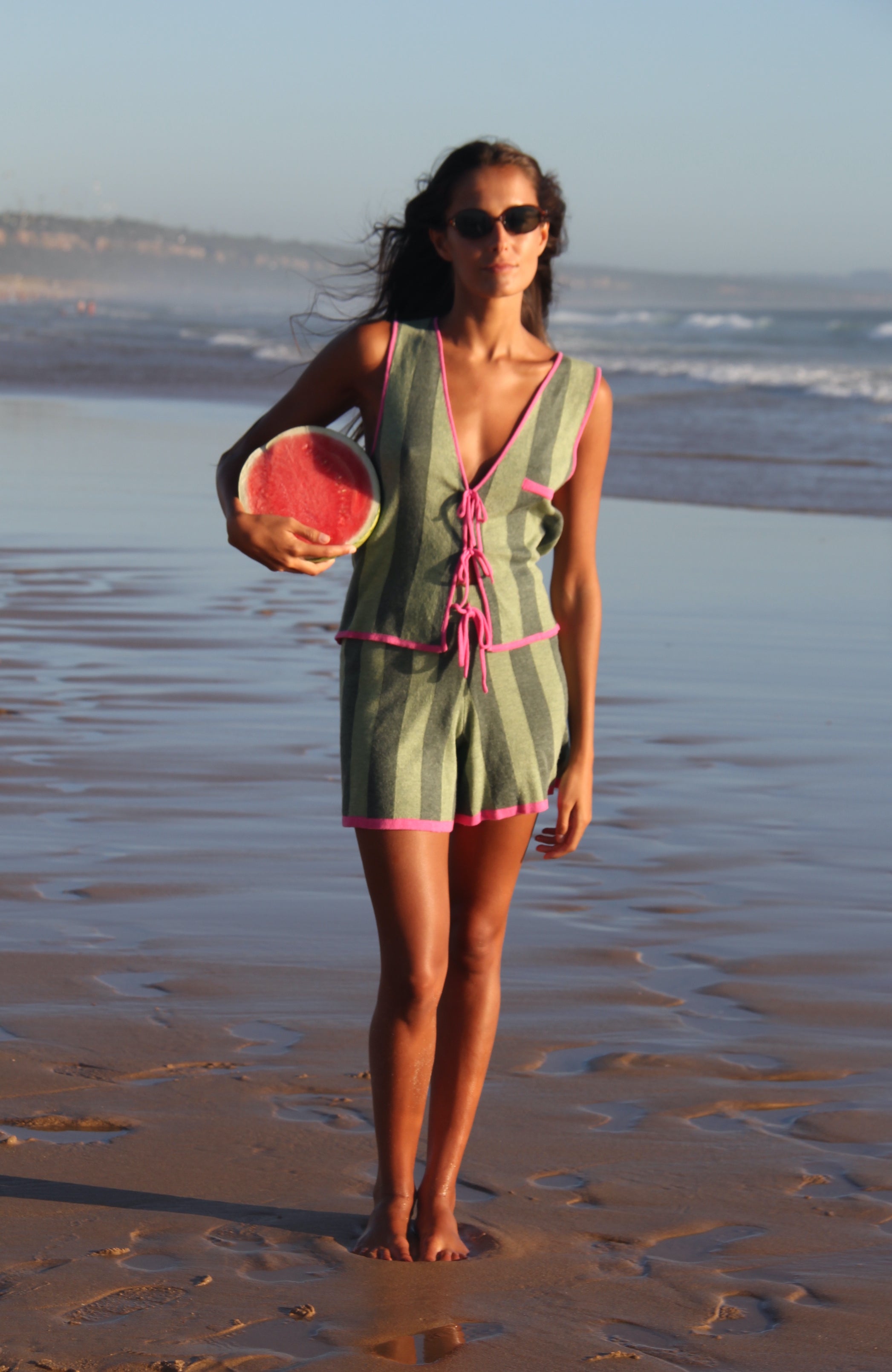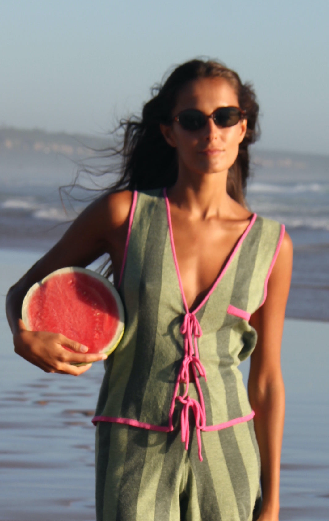 Gillette tejido confeccionado en algodón reciclado y viscosa. Diseño rallado con detalles a color. Amarras delanteras para ajuste.